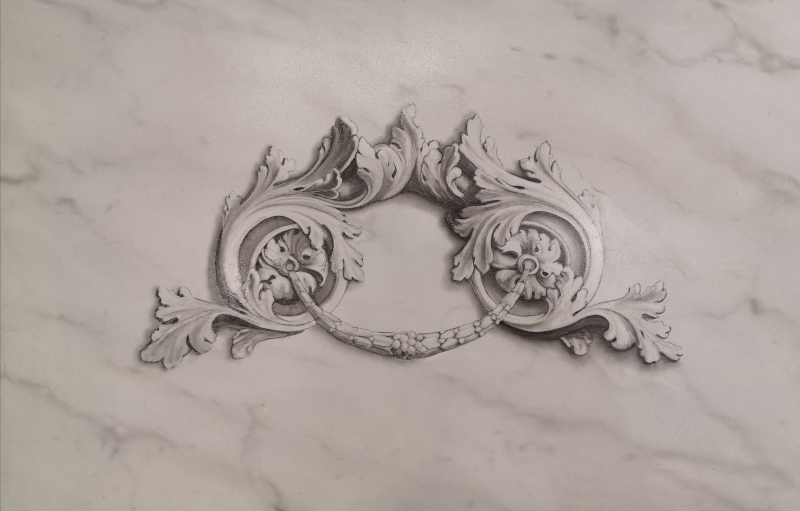 Le décor est réalisé à l’huile, il représente une ornementation en feuilles d’acanthe sur un faux-marbre de type blanc veiné.